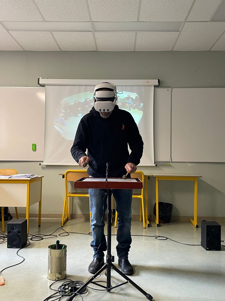 Explorer les espaces du quotidien liés à l’intimité, au repos, au travail et au loisir, à travers la création artistique, l’objet et les technologies immersives.En collaboration avec l’équipe pédagogique du lycée Fourneron, ce projet pédagogique prend la forme d’une installation sonore interactive mêlant création artistique, objets et technologies immersives.J’accompagne les élèves dans un processus de création sonore à partir d’objets, envisagés comme des supports sensibles et narratifs. À partir de ces objets, les élèves développent des matières sonores et musicales en utilisant un casque de réalité virtuelle, qui devient un outil d’interaction en temps réel entre le geste, l’espace et le son.